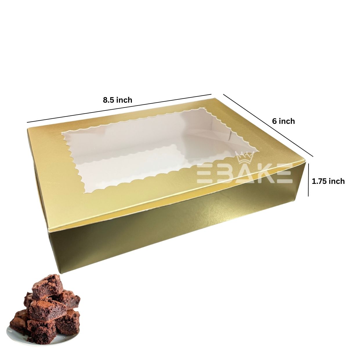 Showcase your brownies and mini treats with elegance and ease using our premium golden brownie boxes. Perfect for gifting, events, or retail display, these boxes feature a clear top window to beautifully highlight your creations while keeping them safe and secure. Their compact size makes them ideal for single-serve brownies, pastries, or other small desserts.