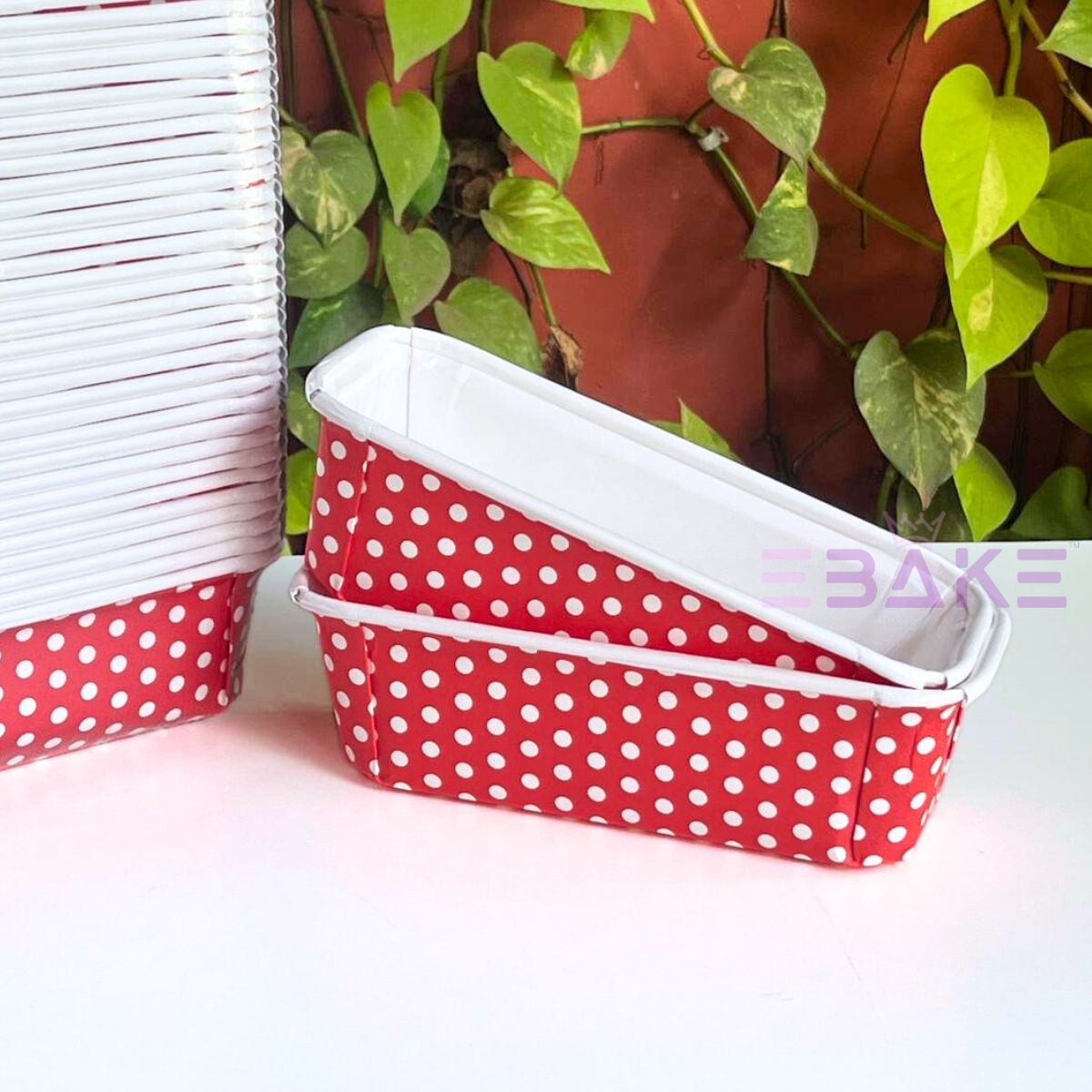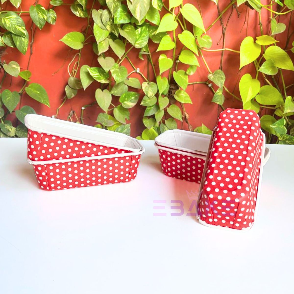 These bake and serve molds (single-dose cooking mold) are cardboard baking shapes designed for the production of plum cakes, but also suitable for other types of dough. The elegant design with white polka dots makes it suitable for the presentation of the finished product. The design with polka dot decoration is studied to enhance your creations and makes the use of an additional presentation packaging superfluous.