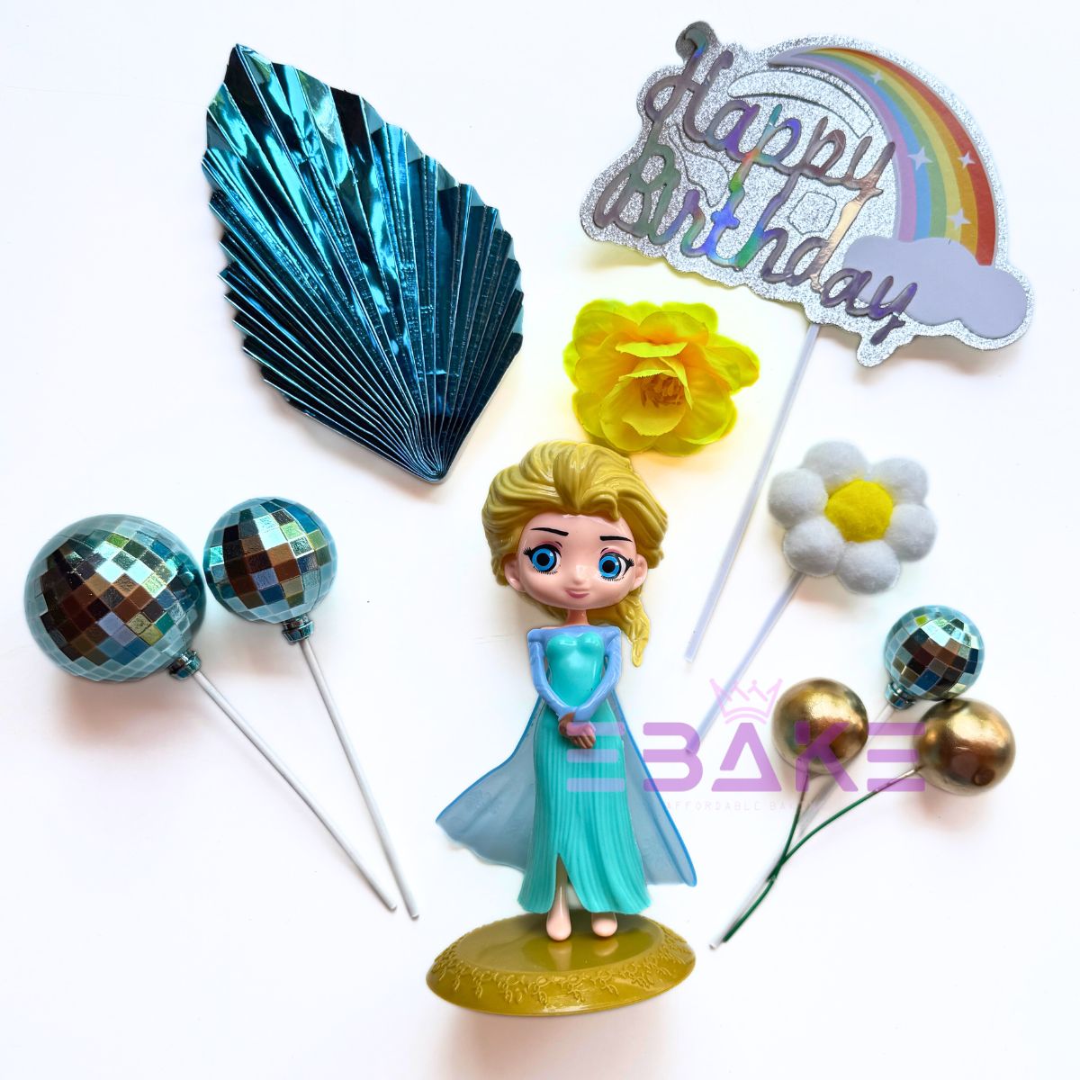 - Package includes: 1 Elsa, 2 golden faux balls, 3 mirror-finish faux balls, 1 happy birthday topper, 1 flower and 1 Palm leaf