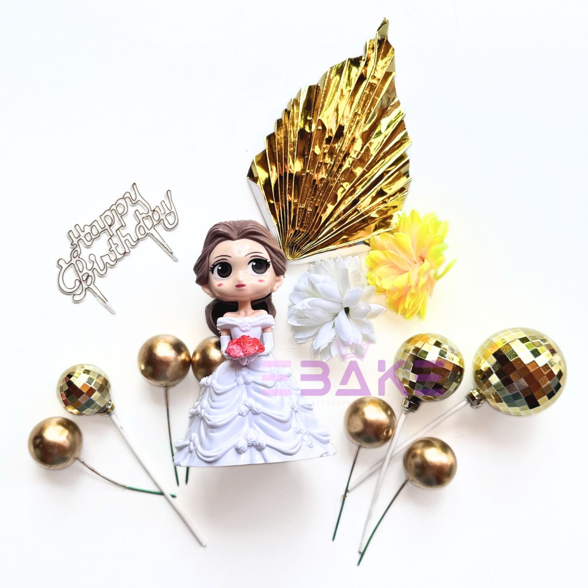 - Package includes: 1 Princess Belle, 3 golden faux balls, 3 mirror-finish faux balls, 1 happy birthday topper, 2 flowers and 1 paper palm leaf