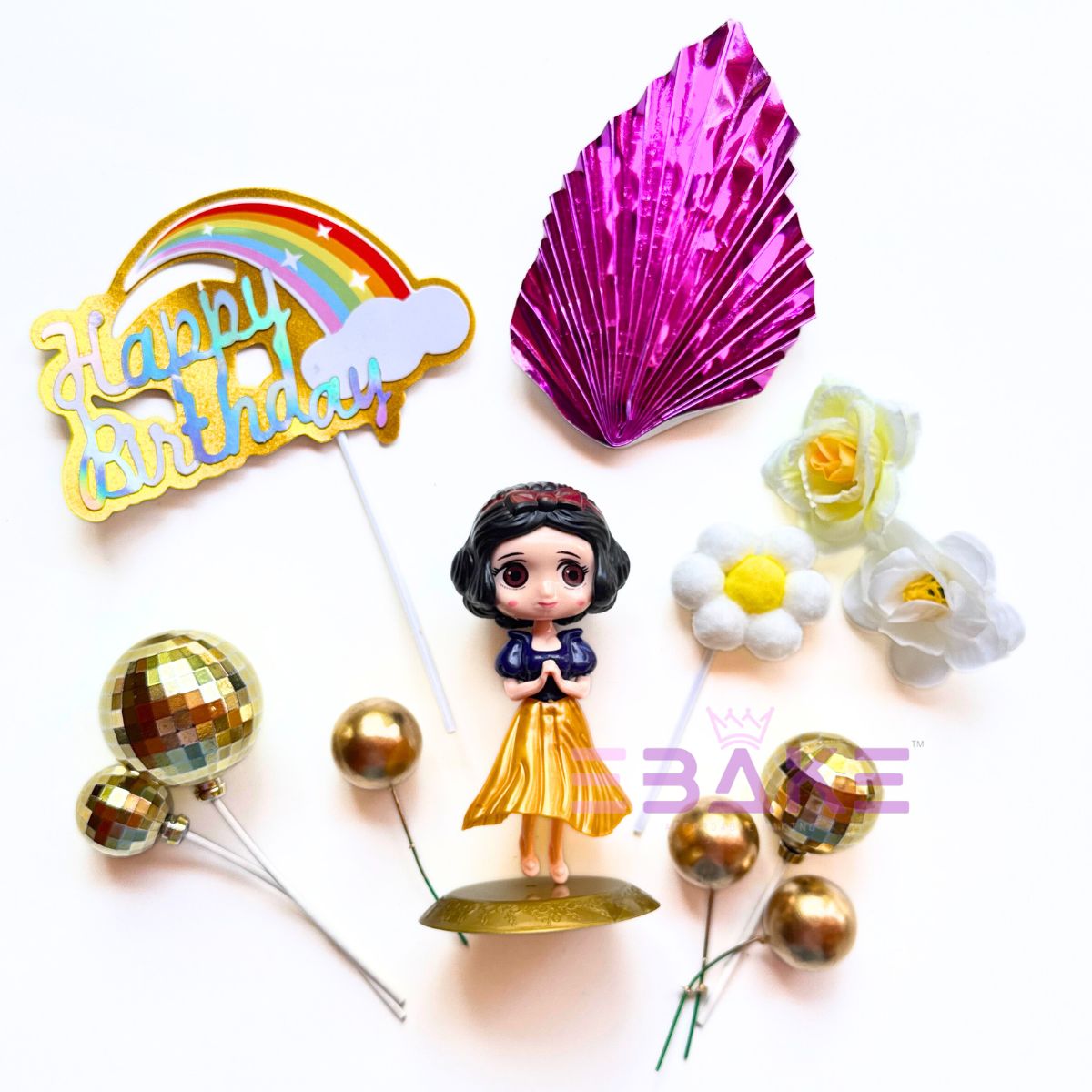 - Package includes: 1 Snow white, 3 golden faux balls, 3 mirror-finish faux balls, 1 happy birthday topper, 3 flowers and 1 Palm leaf