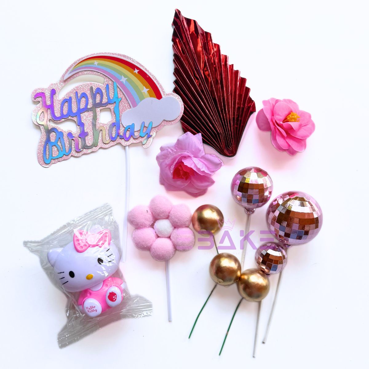 - Package includes: 1 Hello Kitty, 3 golden faux balls, 3 mirror-finish faux balls, 1 happy birthday topper, 2 flowers and 1 Palm leaf