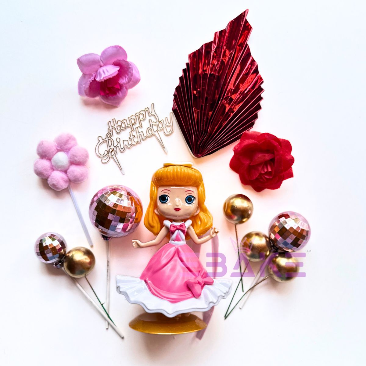 - Package includes: 1 Princess Aurora, 3 golden faux balls, 3 mirror-finish faux balls, 1 happy birthday topper, 2 flowers and 1 Palm leaf