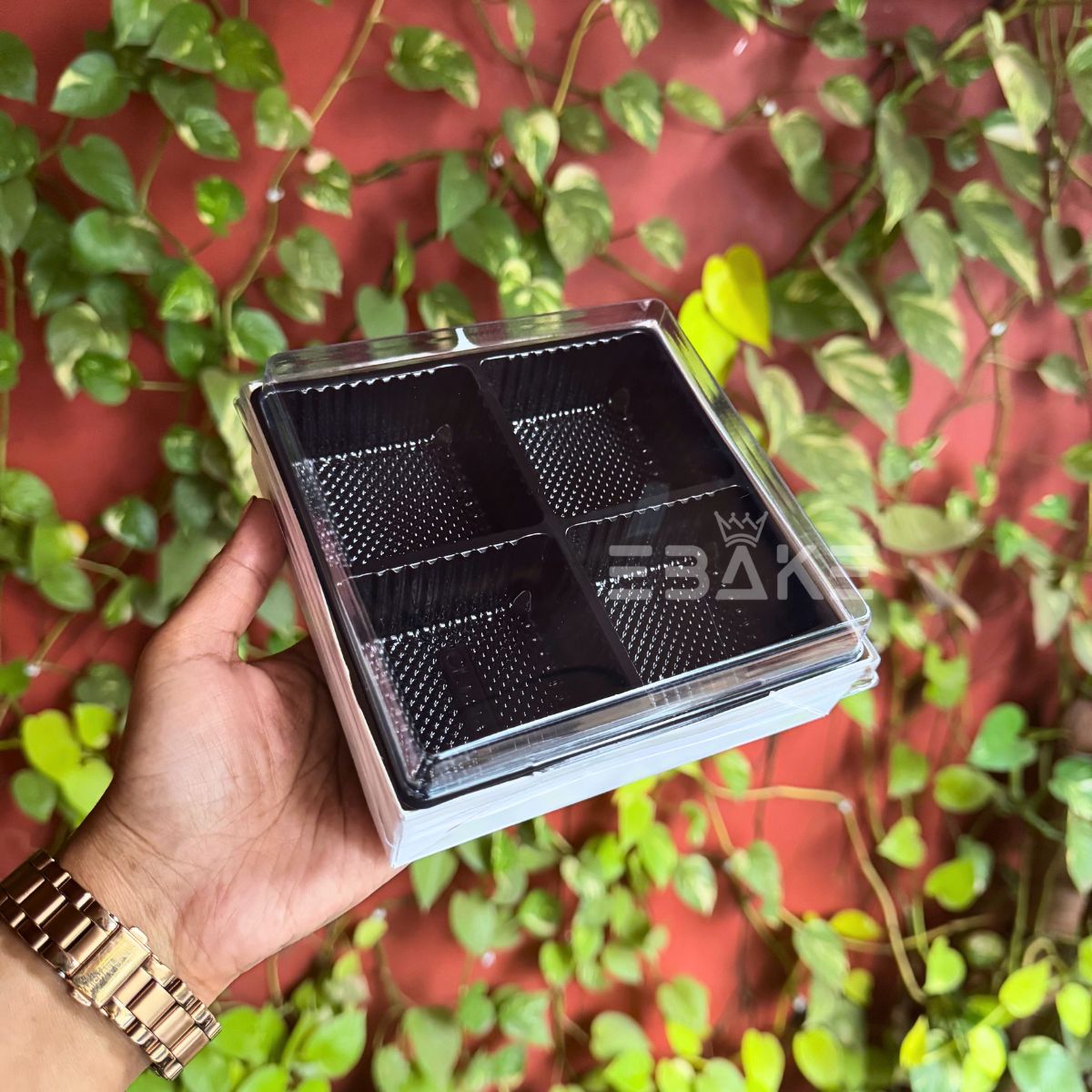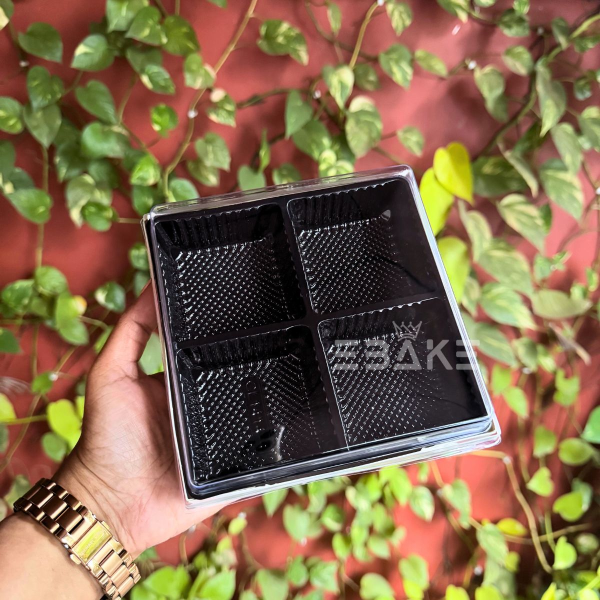 - 4 cavity brownie box with a clear transparent lid and black cavity.